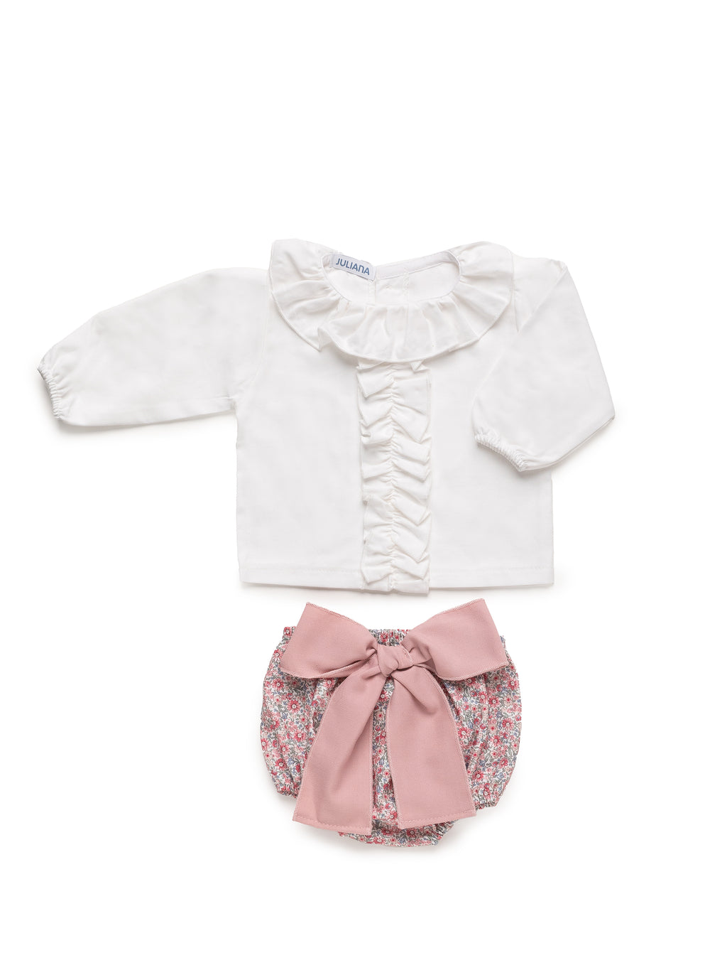 Un conjunto delicado y cómodo. La camisa blanca, de manga larga, presenta un volante en el cuello y detalle fruncido de volantes en el centro. La ranita en tejido floral y tono maquillaje, se adorna con un gran lazo de tela a tono.