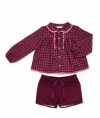 Conjunto encantador para niña, compuesto por camisa de cuadros en tonos granate y rosa empolvado, con detalles de volantes y botones delanteros. Se combina con un short de pana en tono granate a juego, cómodo y con cintura elástica.