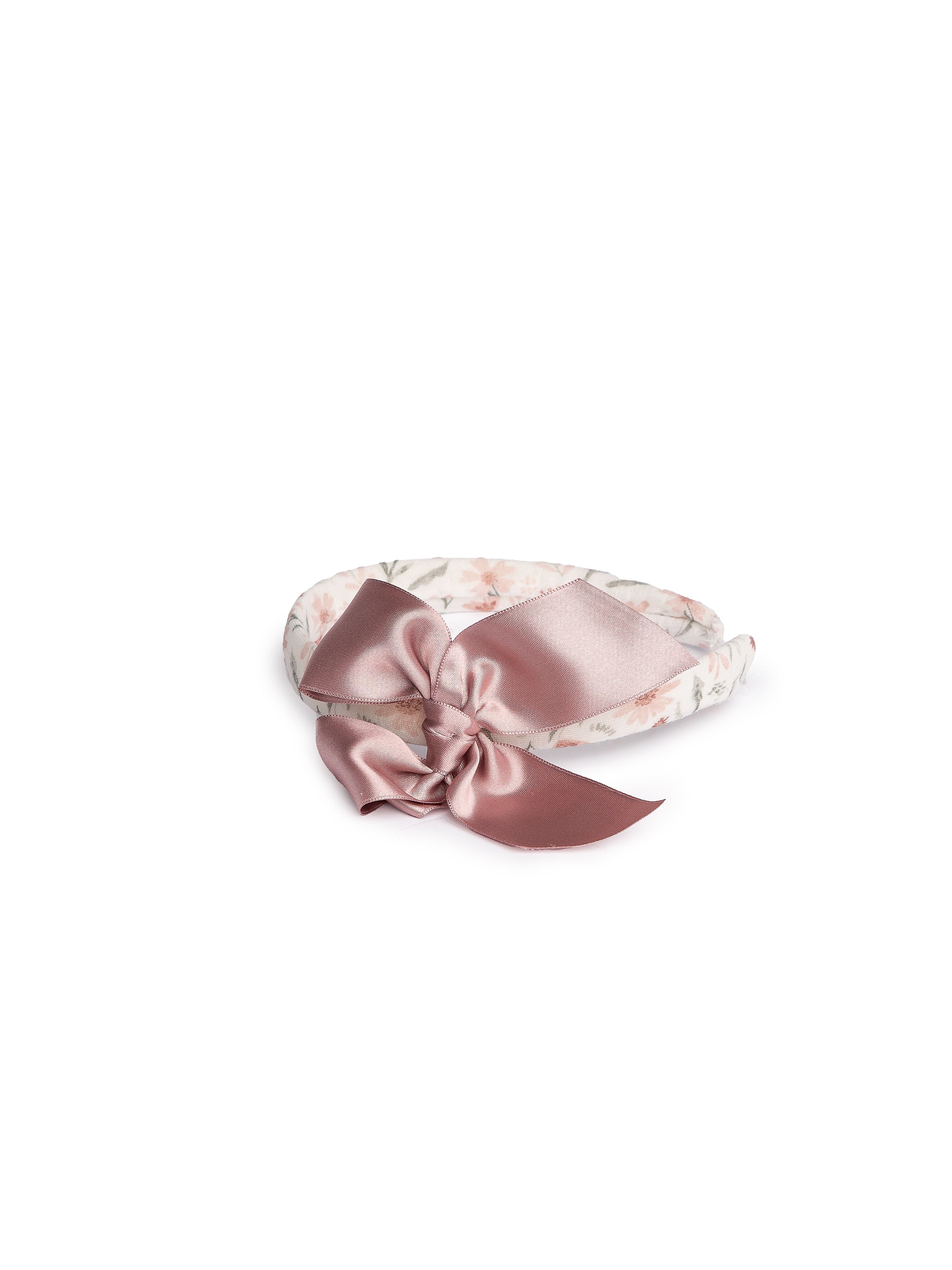 Diadema forrada en tejido floral de tonos suaves, con un lazo de raso en rosa empolvado que le aporta dulzura y elegancia. Ideal para acompañar conjuntos coordinados o como detalle especial para realzar cualquier look.