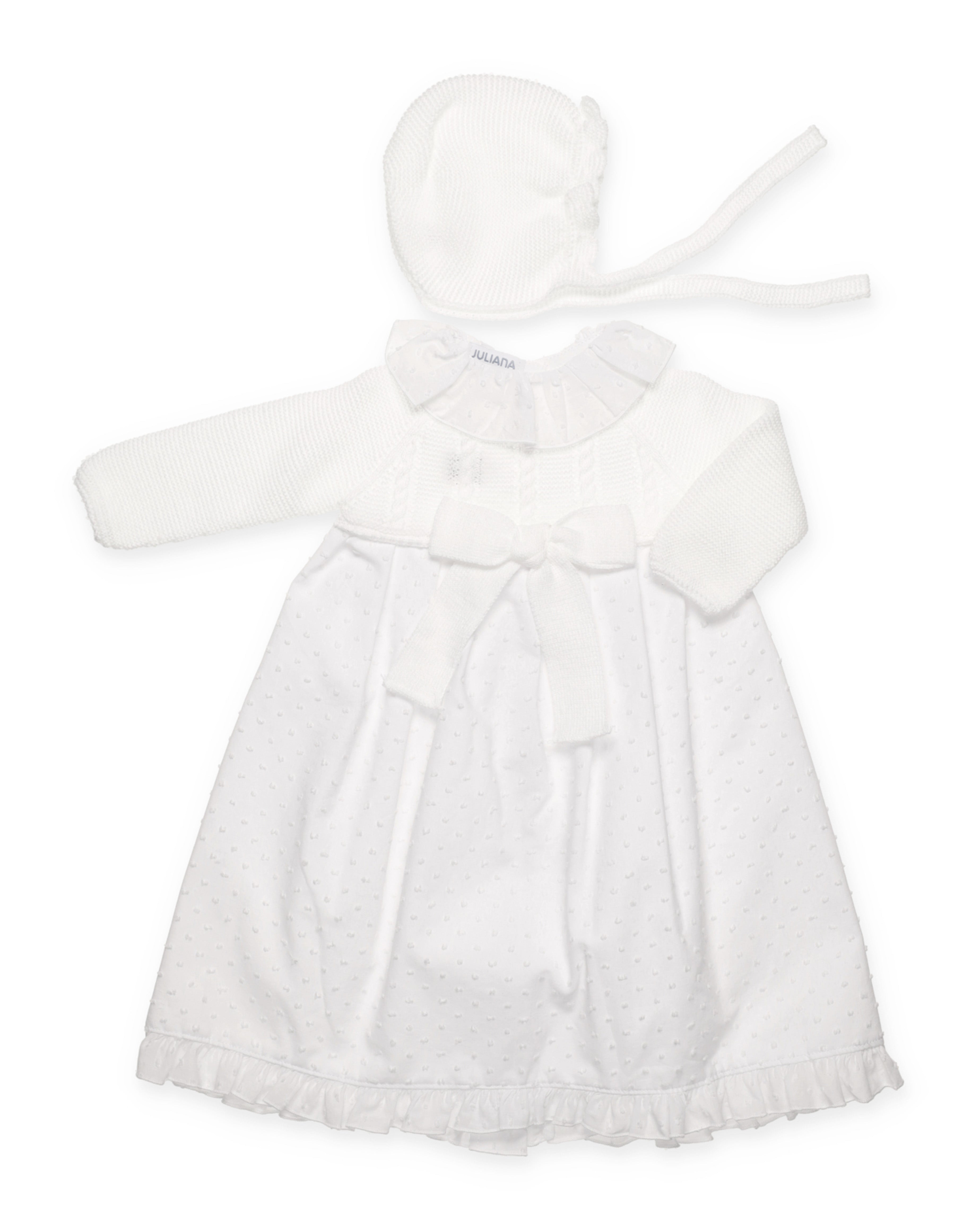Faldón con cuerpo de punto tricot y falda de tela plumeti. Diseño ligero con vuelo suave. Cierre en la espalda con botones. Acabado delicado en cuello y puños.