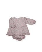 Jesusito de estampado floral en tonos maquillaje con delicada pechera blanca adornada con puntilla. Los volantes en los hombros y el bajo añaden un toque dulce. Incluye ranita a juego para una presentación impecable.