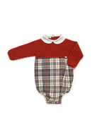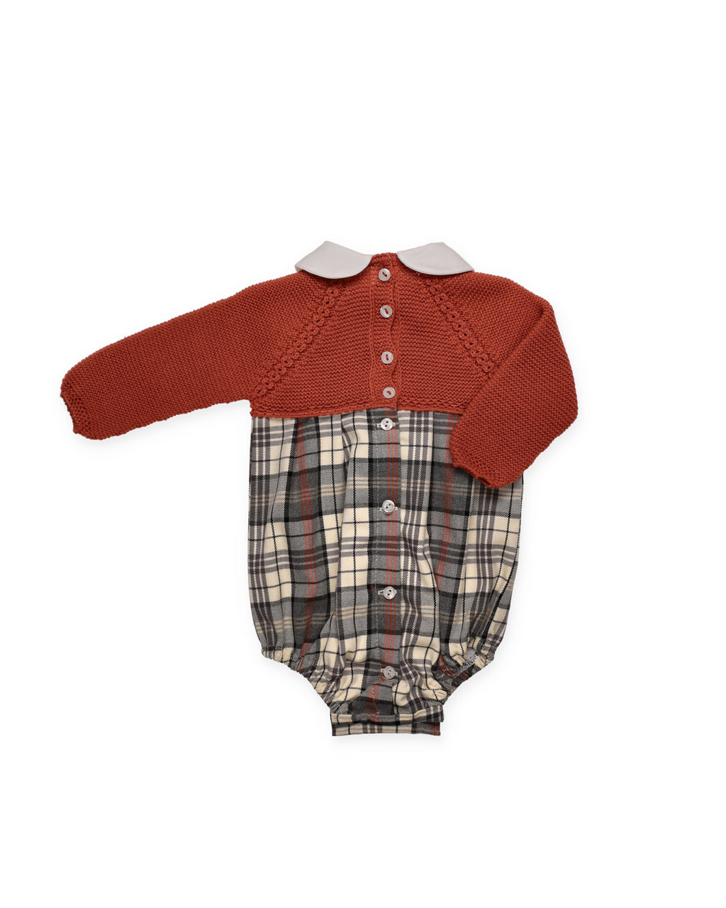Pelele con cuerpo de punto tricot con manga larga y cuello bebé de tela crudo que aporta luz. La parte inferior combina un tejido de cuadros en tonos crudo, gris y caldera, evocando los paseos otoñales y los momentos en familia. Cierre trasero y entrepierna con botones para facilitar el cambio.
