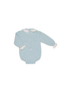 Pelele de manga larga confeccionado en punto tricot. Destaca su delicado cuello calado en crudo y los detalles de los puños. El lacito en el centro con pompón aporta un toque encantador. Cierre cómodo con botones en la parte inferior y espalda.