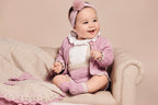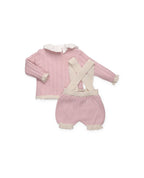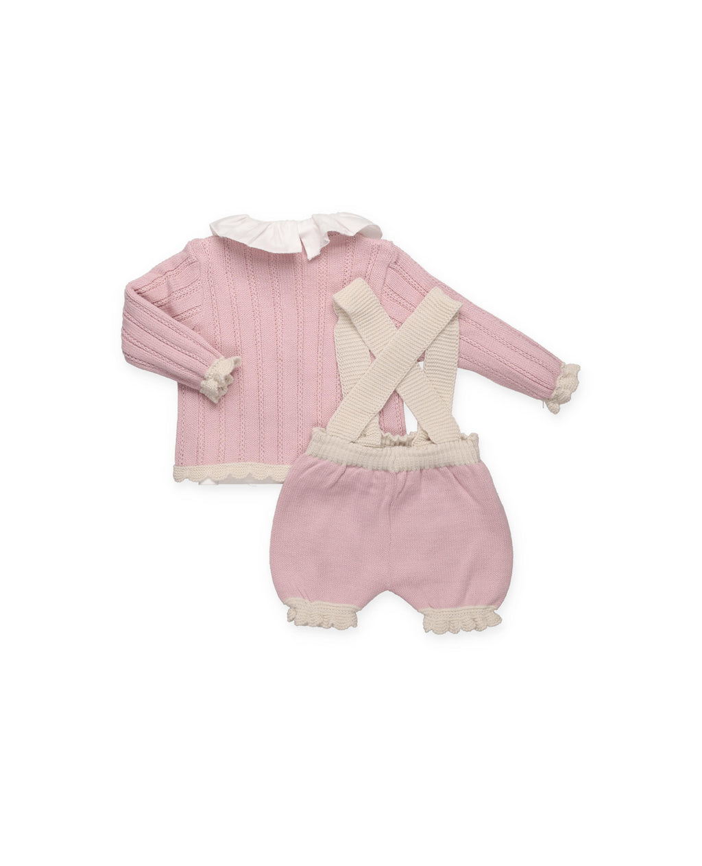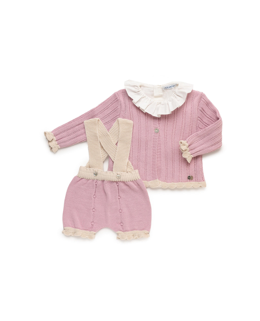 Conjunto de tres piezas en punto maquillaje con detalles en crema. Chaqueta con dibujo calado y remates a contraste en puños y bajo, camisa de tela con volante en cuello. Peto corto a juego con tirantes en crema y pequeños detalles de bodoques.