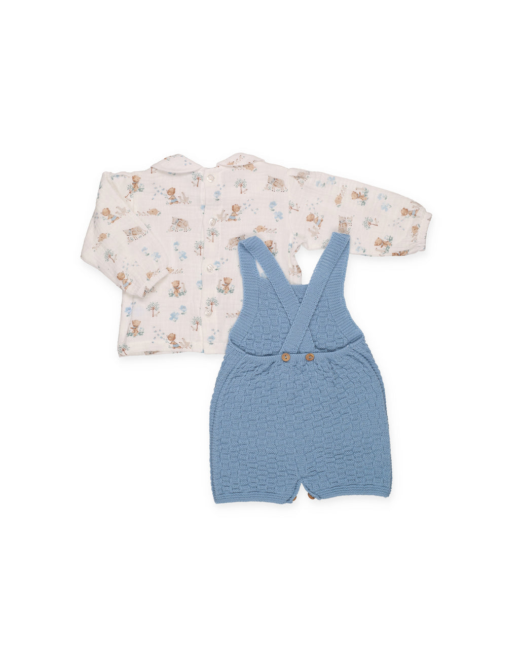 Peto de punto tricot con dibujo de cuadritos y botones de madera en la entrepierna. Lo acompaña una camisa de manga larga con estampado de ositos y cuello redondeado a juego.
