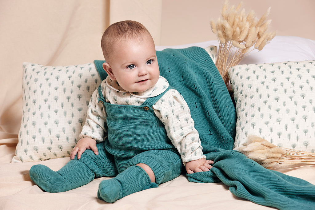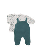 Peto largo en punto tricot verde báltico y camisa de manga larga en tejido suave con estampado de árboles. El peto, de corte cómodo, se sujeta con botones de madera. La camisa incluye cuello redondo, ideal para lucir debajo del punto.