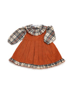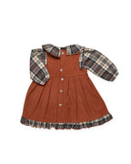 Pichi de pana en color caldera, con vuelo y pliegues marcados. Camisa en tejido de cuadros crudo, gris y caldera a juego con las mangas, el cuello volante y el bajo.