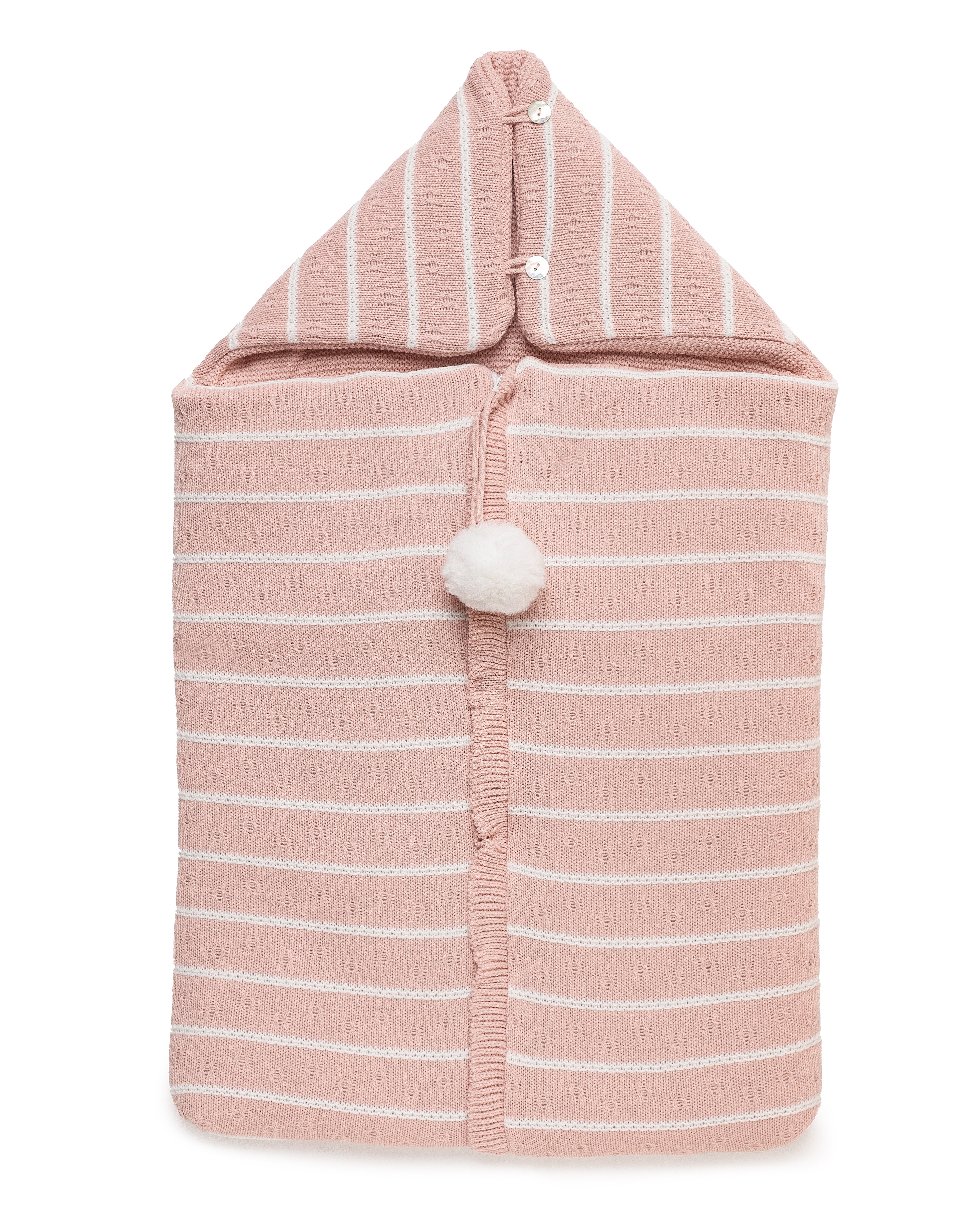 Saco de punto con capucha y diseño a rayas en punto trenzado. Apertura frontal con botones para facilitar su uso. Acabado elástico en los bordes para mayor ajuste.