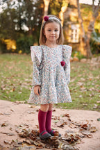 Vestido de manga larga con estampado floral. Lleva volante fruncido en el delantero con ribete a contraste y pompón decorativo al tono. Bajo con volante.