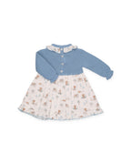 Vestido de punto tricot con cuerpo liso y falda estampada en muselina blanca con dibujos de ositos en tonos tierra. El cuello volante a juego con la falda añade un toque muy dulce.