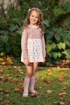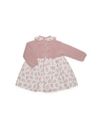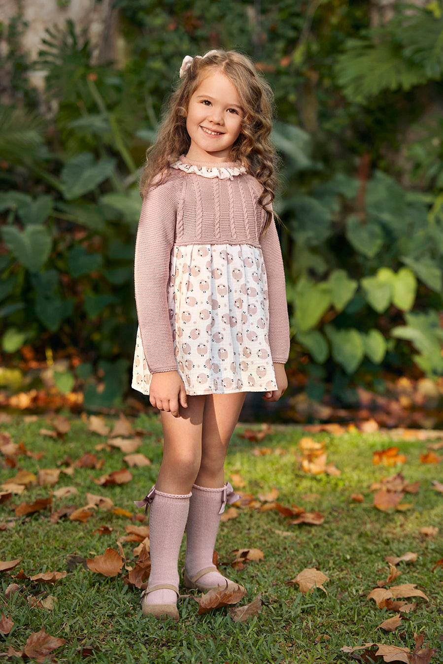 Vestido de punto tricot con delicado calado central en el cuerpo. La falda es de muselina blanca con un simpático estampado de ovejitas, a juego con el cuello volante.